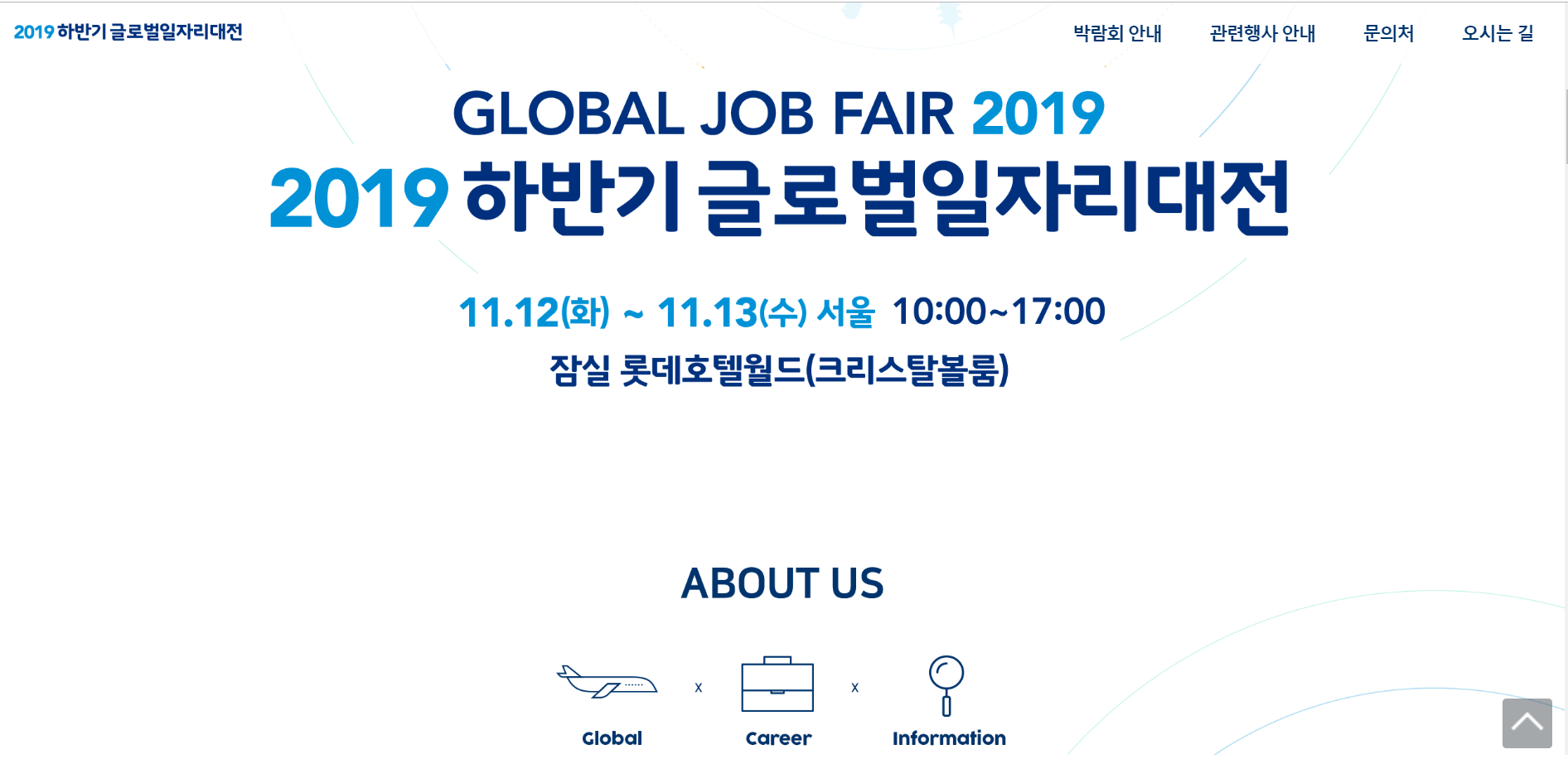 안녕하세요. 해외취업을 생각하시고 계신 분들이라면 해외취업박람회 참가 역시 고려하시고 계시는 분들이 많으시다고 생각이 드는데요. 이번 2019년 하반기 글로벌 일자리 대전이 11월 12일-13일 서울 잠실 롯데호텔 월드에서 열리므로 관심 있으신 분들은 참고 바라겠습니다. 그전에 아래 링크와 같이 월드잡 사이트로 들어가셔서